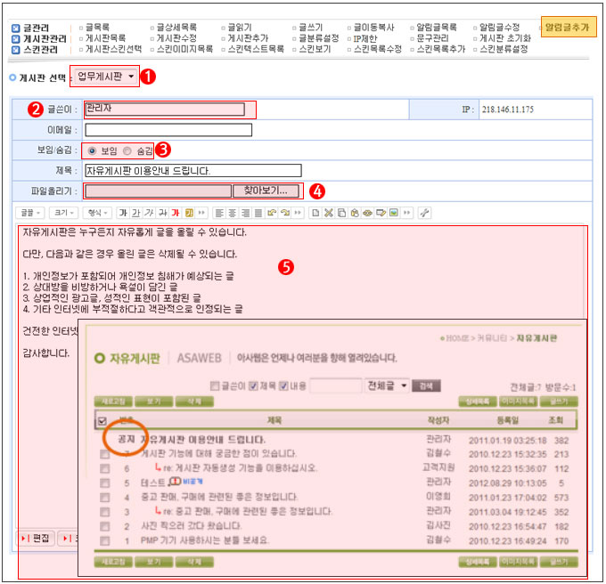 | ① 알림글을 올리고자 하는 게시판을 선택한 후 알림글을 작성합니다. |