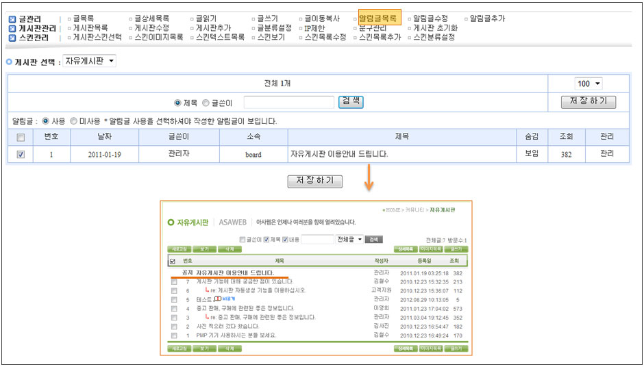 | 보임으로 설정했는데도 해당 게시판에 보여지지 않으면 해당 게시판의 글목록설정에서 알림글이 사용으로 설정되어 있는지 확인하시기 바랍니다. |