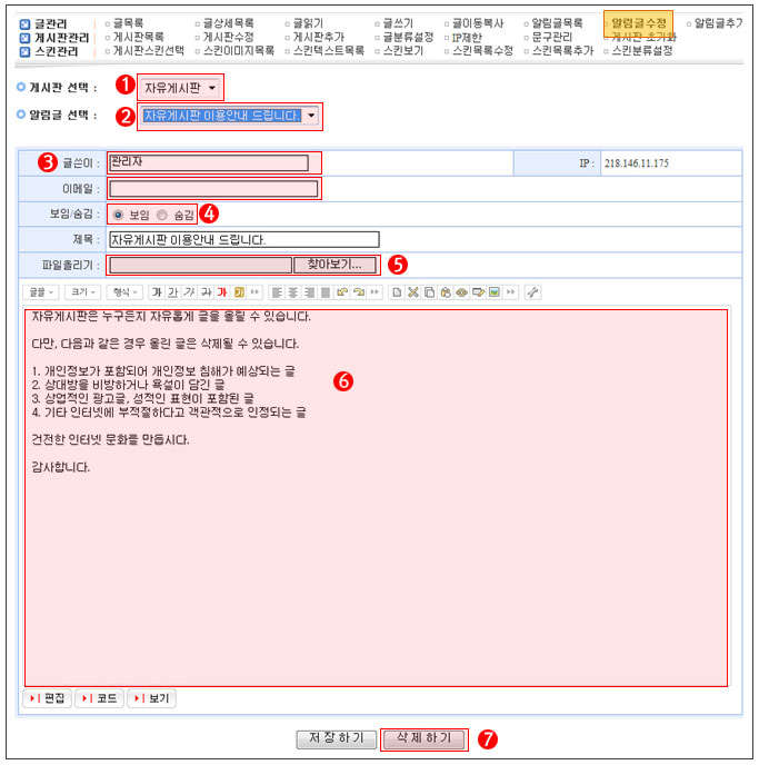 | ⑥ 알림 글 내용을 편집할 수 있습니다. |