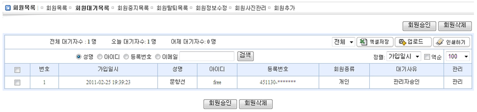 | (3) 목록의 체크박스에 체크를 한 후 “회원승인” 버튼을 클릭하면 해당 회원은 회원으로 승인이 되며, 로그인을 할 수 있습니다. “회원삭제” 버튼을 클릭하면 해당 목록을 삭제합니다. |