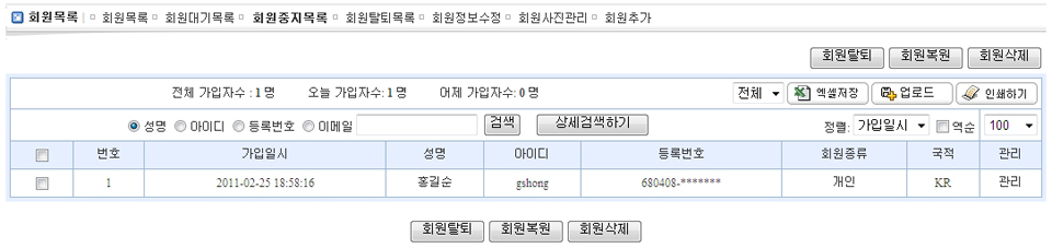 | (8) 중지된 회원은 로그인을 할 수 없습니다. 중지된 회원은 회원중지목록에서 다시 복원을 할 수 있습니다. |