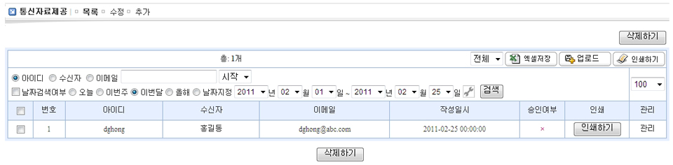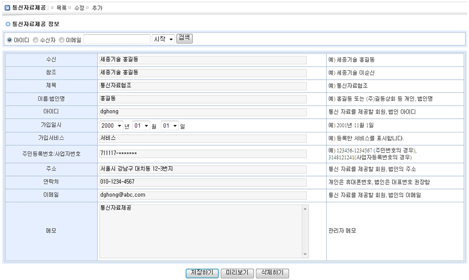 2. 통신자료제공 시 해당 내용을 추가하기 위해서 “추가” 페이지에서 해당 내역을 기재합니다. 기재된 내용은 “목록”에 나오며, “목록”의 관리를 클릭하면 상세