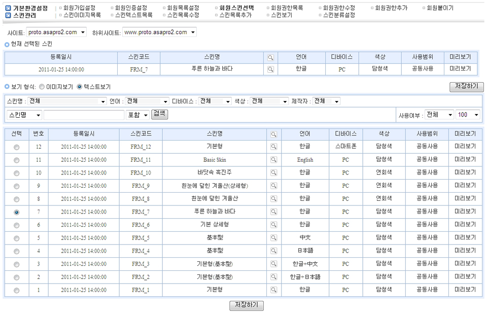 | (1) 스킨텍스트목록은 회원관리에서 사용할 스킨의 목록을 텍스트 형식으로 볼 수 있습니다. |