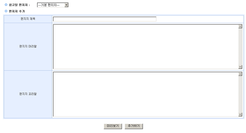 | (2) 편지지 제목은 원하는 제목으로 붙이면 됩니다. 메일 발송 시 사용되지는 않으며 관리자가 어떤 편지지인지 구분할 수 있는 제목으로 붙여 주시면 됩니다. |