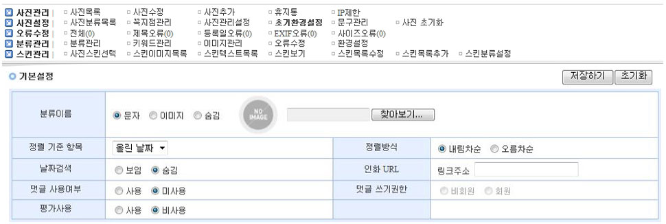 | (1) 사진 분류별 대표이미지, 정렬방식, 검색기능, 댓글, 평가 사용 여부 둥의 정보를 수정할 수 있습니다. |