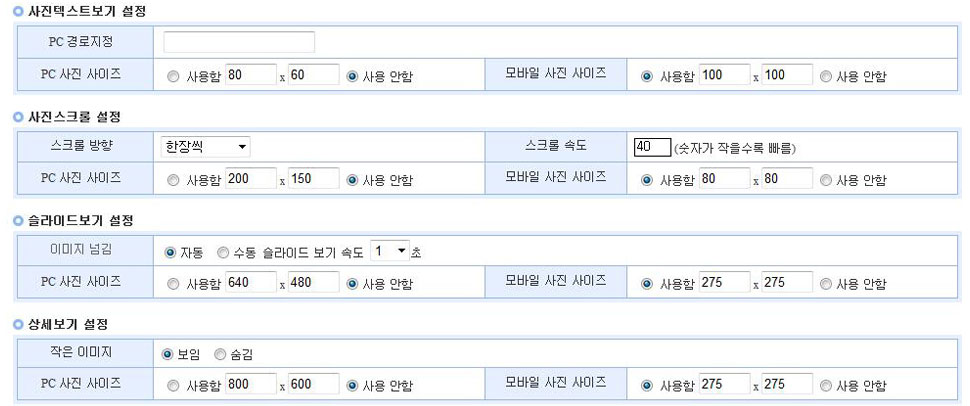 | (2) 사진의 목록에 표시되는 제목의 글자수, 보기 이미지수, 사진크기 등을 수정할 수 있습니다. |