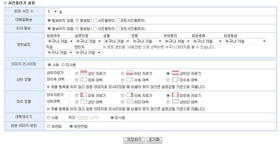 | (6) 사진올리기시 사진 리사이징 기본 설정값을 지정할 수 있습니다. |