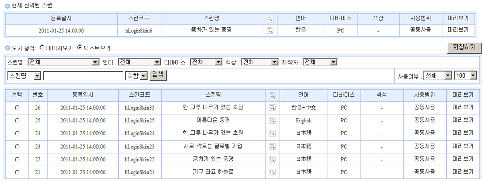 | (4) 보기 형식을 텍스트보기로 선택하면 아래와 같이 텍스트로 된 테이블 형태로 로그인 스킨이 표시됩니다. |