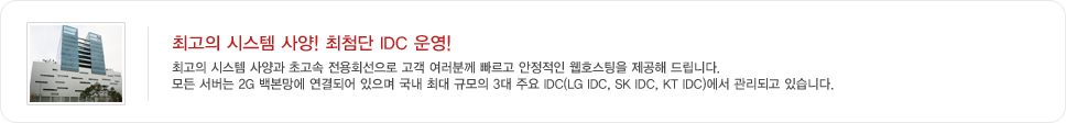 저희 회사에서 호스팅을 받으시면, 국내 최대의 서버호텔인 KIDC에 귀하의 홈페이지를 올릴 수 있습니다. KIDC의 주요 고객은 KBS, MBC, SBS, 중앙일보, 한겨레 등 주요 언론사와 야후코리아, 심마니, 다음, 드림위즈, 쎄이클럽 등 주요 포탈 사이트, 그리고 롯데닷컴, LG마트, 옥션 등 주요 인터넷 쇼핑몰 사이트 등입니다. 저희 호스팅을 받으면 국내 최초, 최대, 최고의 서버호텔인 KIDC에서 귀하의 홈페이지를 운영하실 수 있습니다.